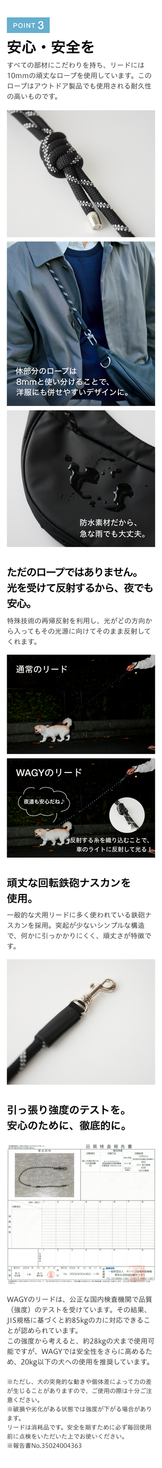 ・当製品は犬のお散歩用リードです。散歩以外での使用はお控えください。犬の推奨体重は20kg以下です。大型犬は引っ張る力が非常に強いため、安全のため使用しないでください。