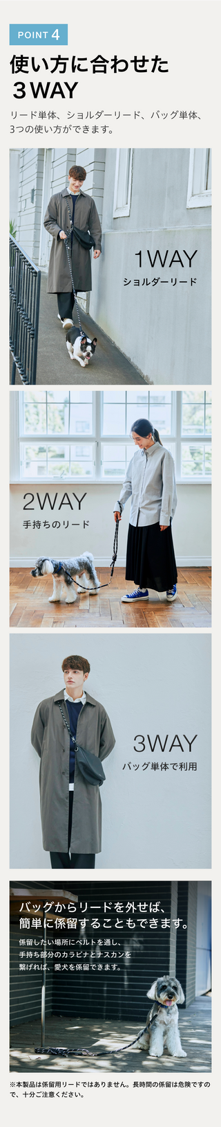 ・本製品はハンズフリーでの使用も可能ですが、犬の引っ張る力は非常に強いため、リードを手で持ちご使用ください。