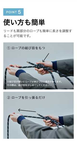 ・ご使用前には必ず、リードや金具、縫製部分の劣化や破損がないかを確認してください。異常が見られる場合は、直ちに使用を中止し、新しい製品に交換してください。