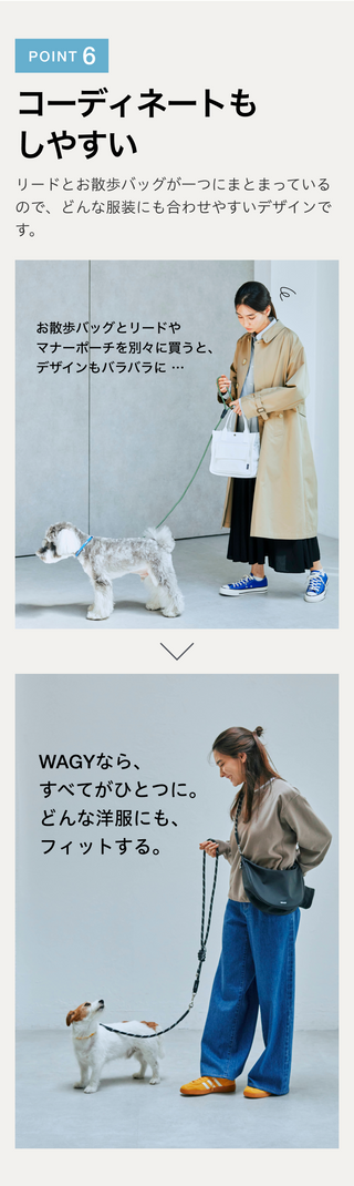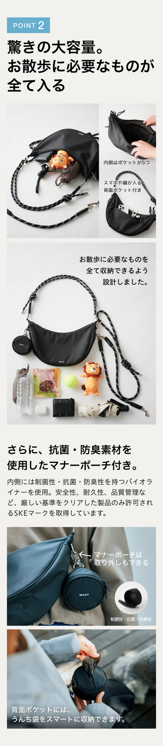 バッグがリードに繋がっているので、急に手が離れてしまっても安全です。リード部分は取り外して手持ちリードとしても使えます。また、防菌・防臭のマナーポーチも付属しています。